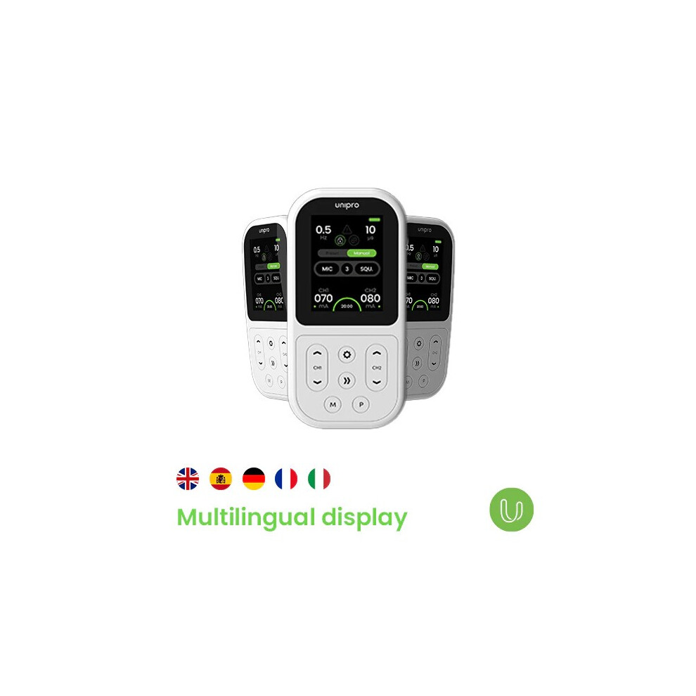 Unipro is designed with user convenience in mind, featuring a new and improved interface that offers preset and manual programs with adjustable treatment times. The device also provides language selection options, including English, Spanish, French, German, and Italian.
