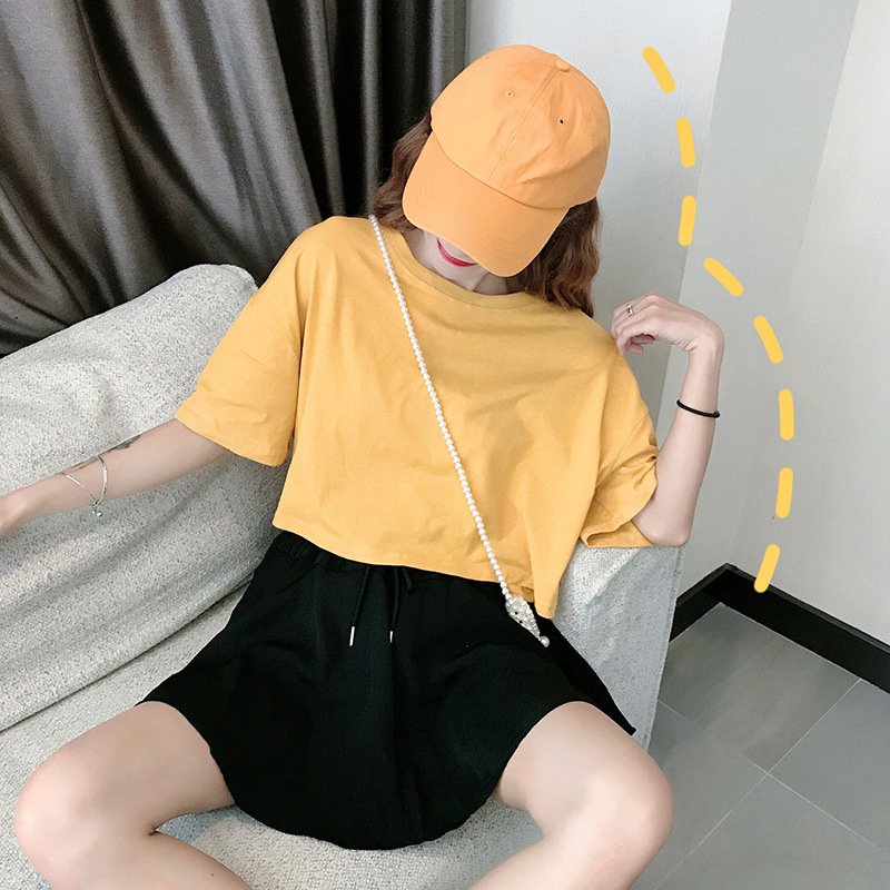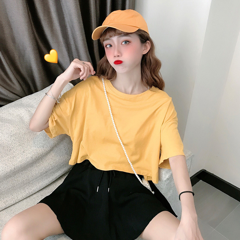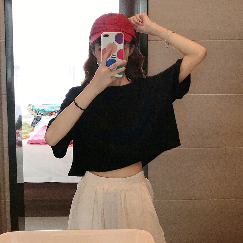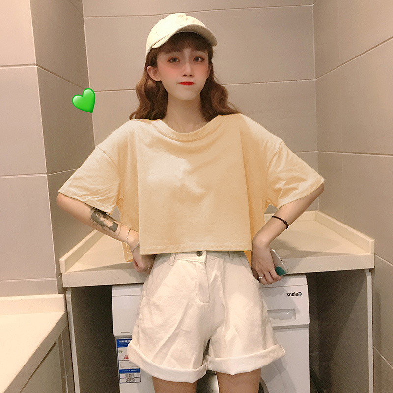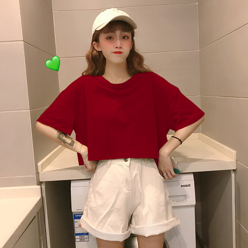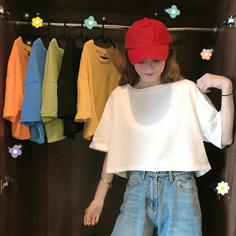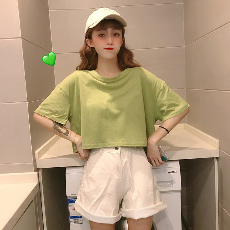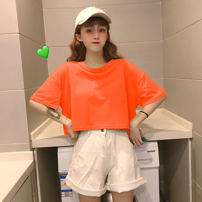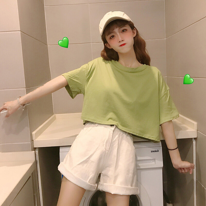 LuFashion女式露脐上衣夏季糖果色短袖素色休闲T恤