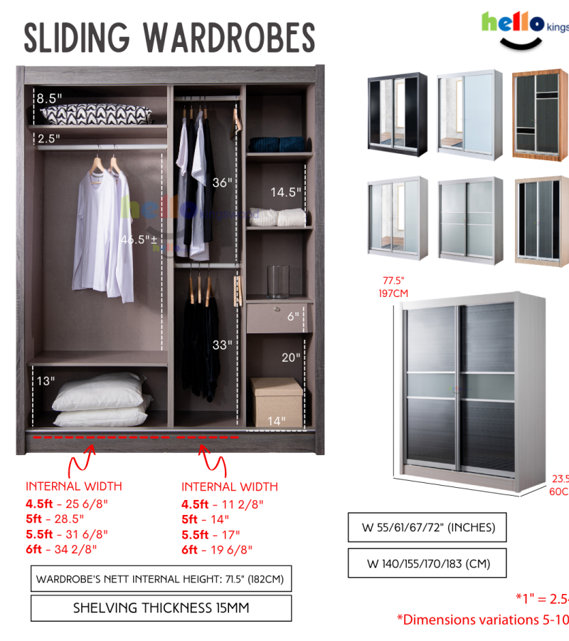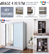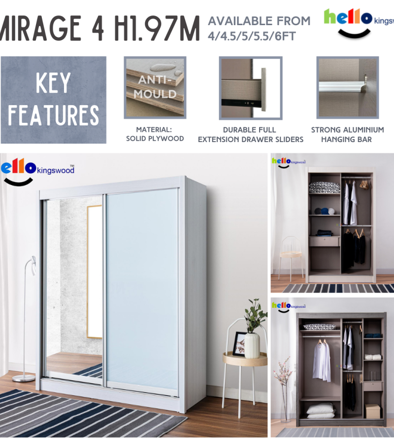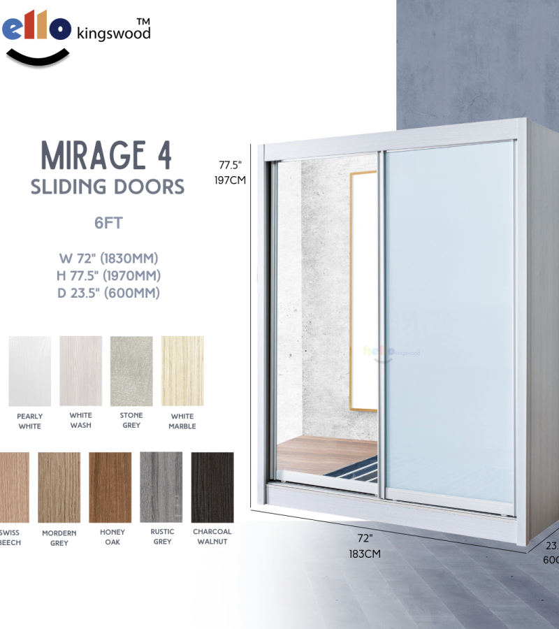 12 months manufacturer warranty included Material: Solid Plywood Sturdy aluminium door frame Strong aluminium hanging bar Durable full extension drawer slides Width: 4, 4.5, 5, 5.5, 6ft Dimensions: H77.5" X D23.5" Frame Colour: Available in 9 trendy colours Mirage 4 Door Design: Full Mirror + Metallic White (Glass) Please PM us if you are looking for height 2.4m sliding wardrobes.