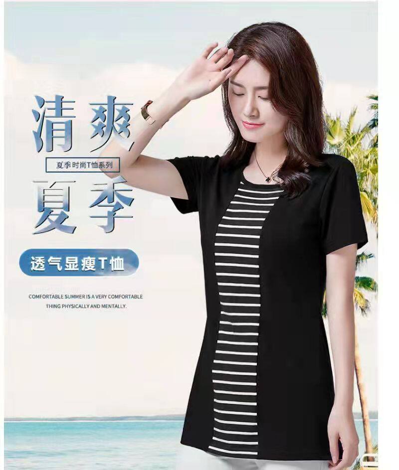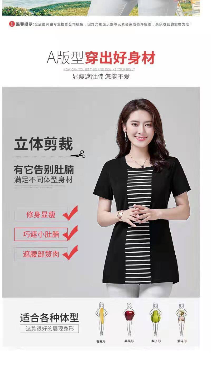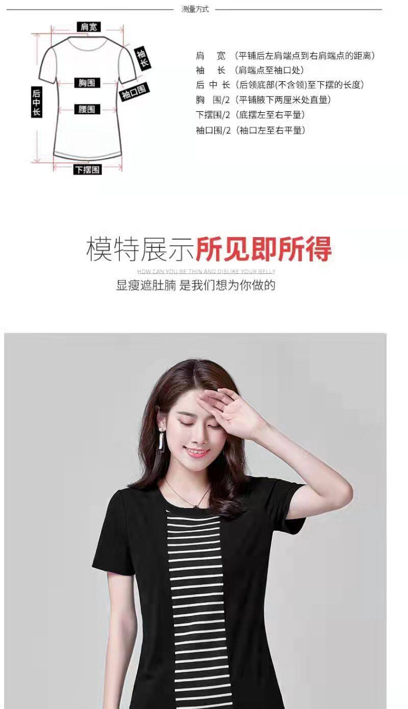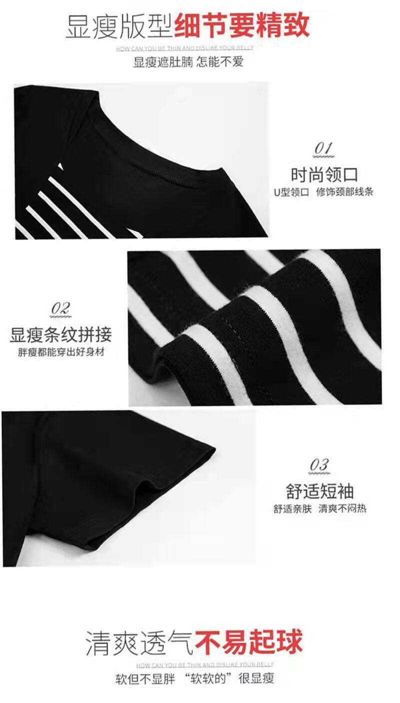 100KG胖女可穿2022新款韩式条纹长袖T恤女式短袖加大码盖腹圆领时尚T恤连衣裙优雅衬衫女式T恤